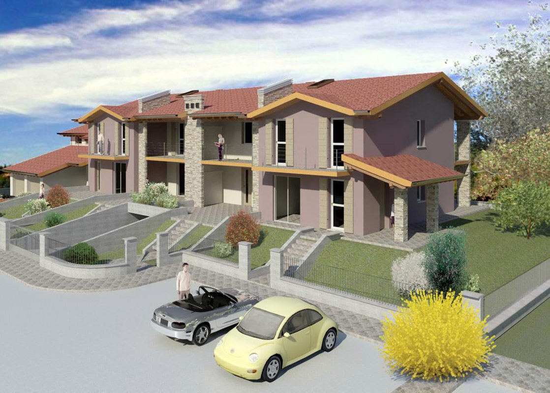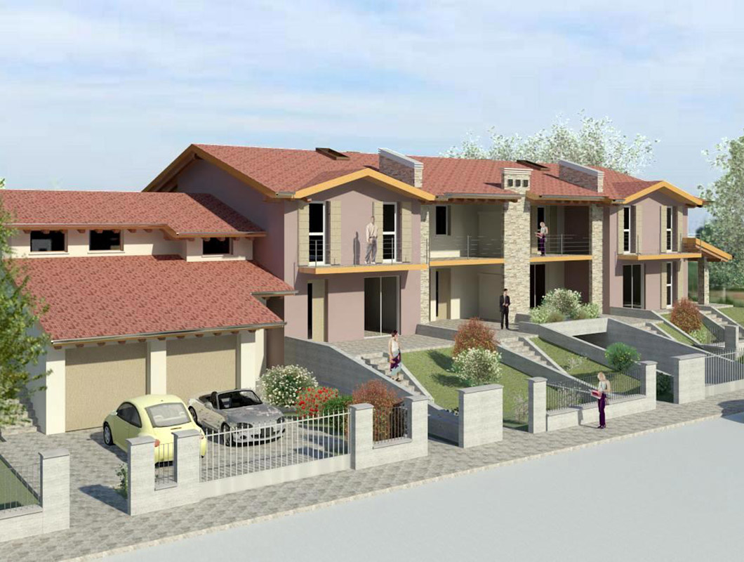 Realizzazione su misura di complesso edilizio formato da quattro abitazioni affiancate, sviluppate ciascuna su due piani fuori terra e uno seminterrato.