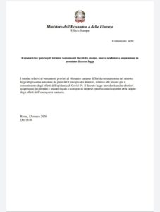Con comunicato stampa n. 50 di oggi, 13.03.2020 ore 18.40, il Ministero dell’Economia e delle Finanze ha annunciato che i termini relativi ai versamenti previsti del 16.03.2020 saranno differiti con un apposito Decreto Ministeriale di prossima adozione.