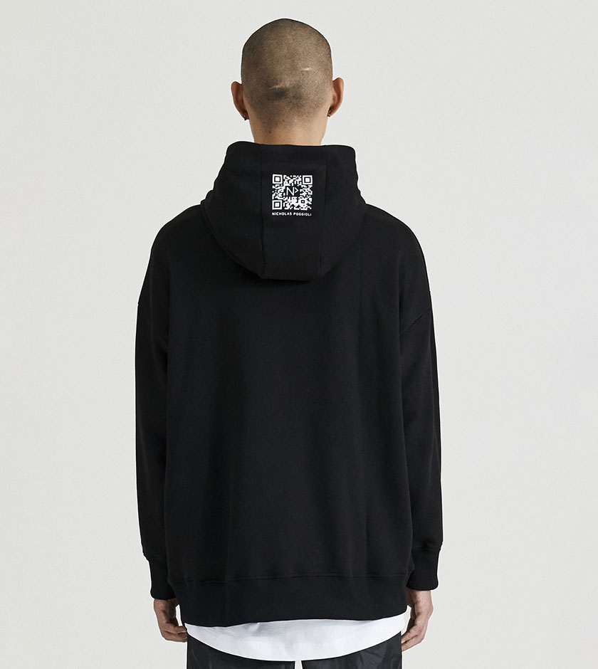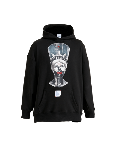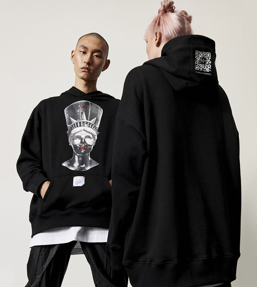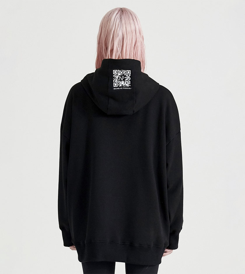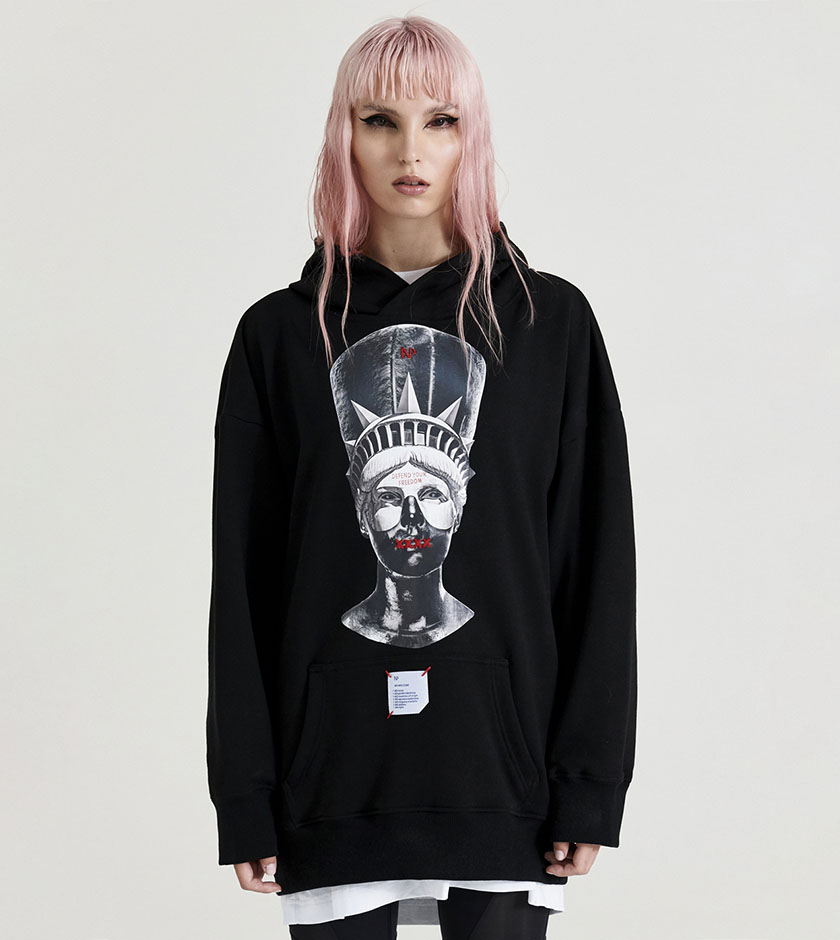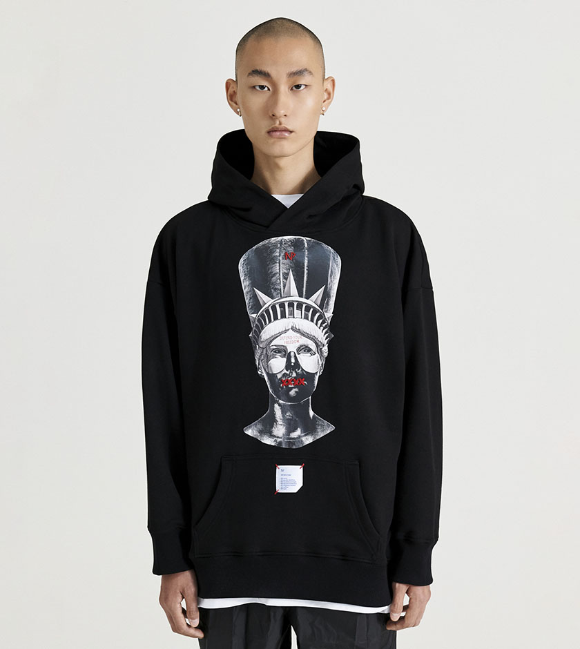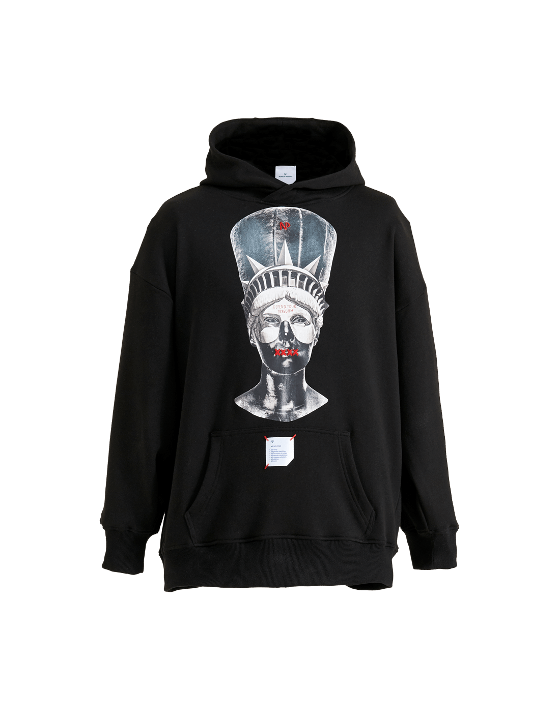 Felpa nera con cappuccio “DEFEND YOUR FREEDOM” 100% cotone organico con dettagli ricamati, vestibilità over unisex.