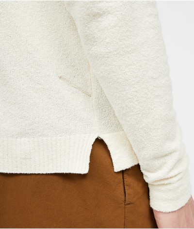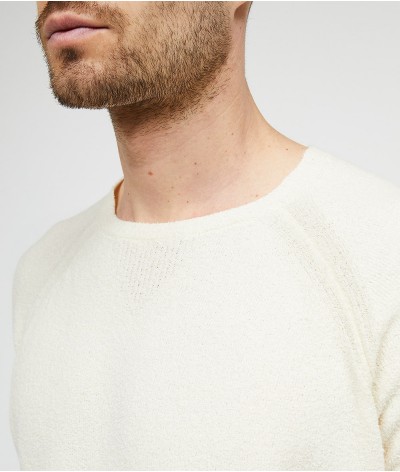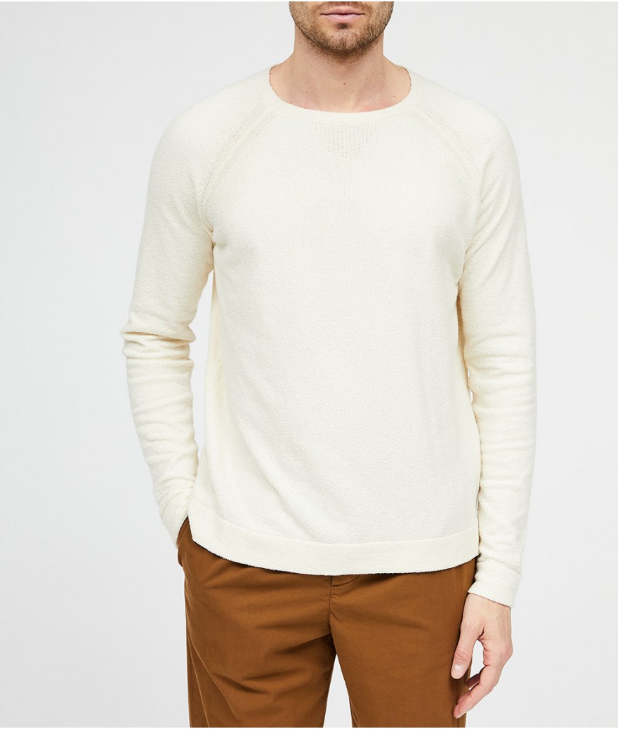 Maglia girocollo a manica lunga raglan, realizzata in fresco tessuto bouclè.