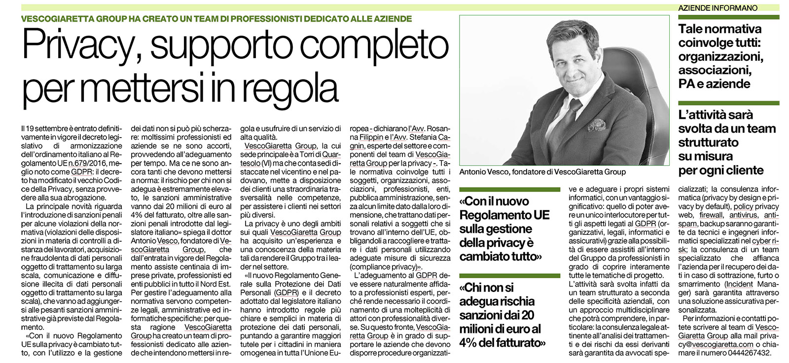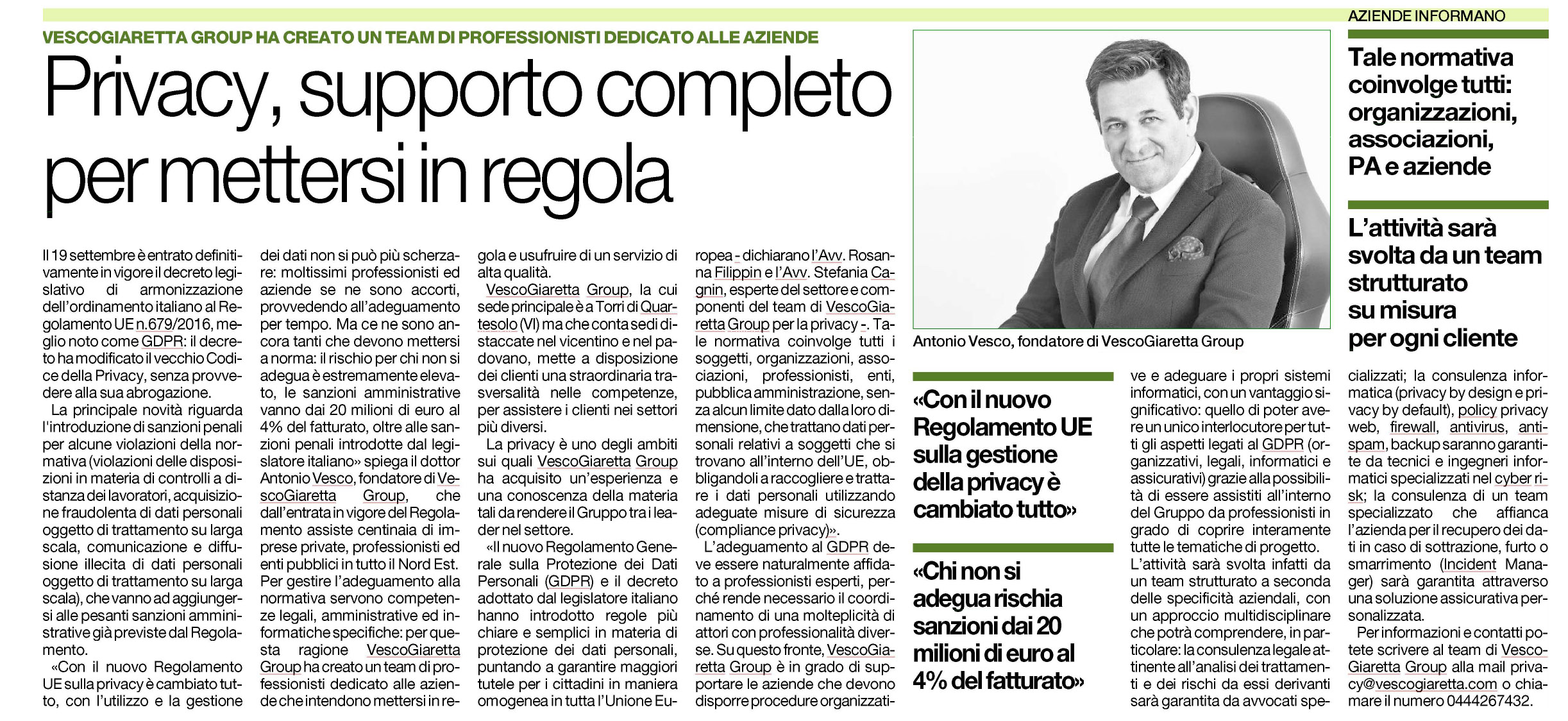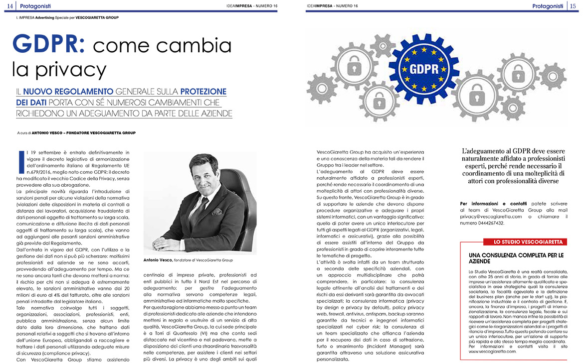 Articolo del 23 ottobre 2018 su Idea Impresa. VESCOGIARETTA Group è in grado di supportare le aziende che devono disporre procedure organizzative e adeguare i propri sistemi informatici, con un vantaggio significativo: quello di poter avere […]