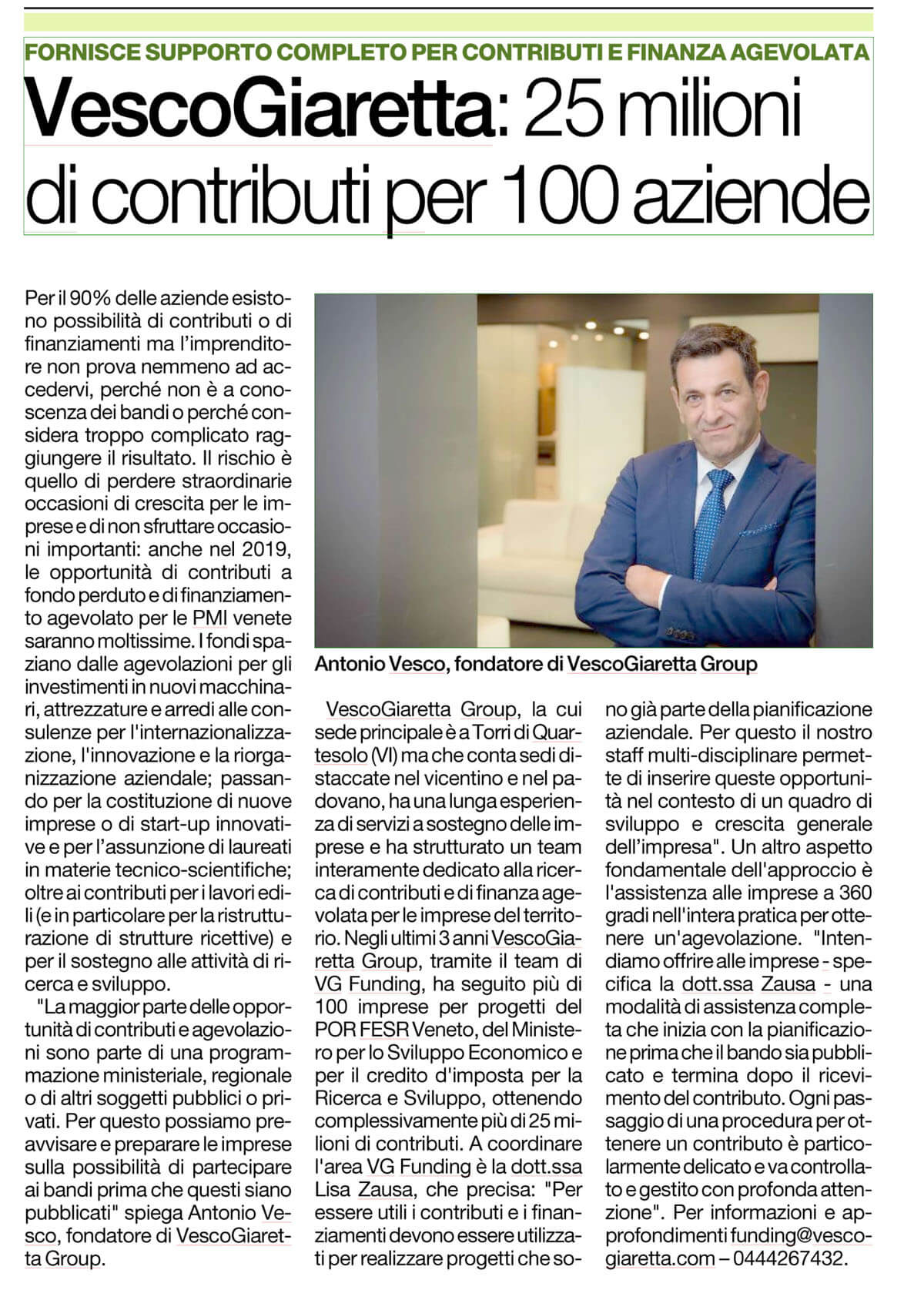 Articolo del 30 dicembre 2018 sul Giornale di Vicenza. Negli ultimi 3 anni VESCOGIARETTA Group, tramite il team di VG Funding, ha seguito più di 100 imprese per progetti del POR FESR Veneto, del Ministero per […]