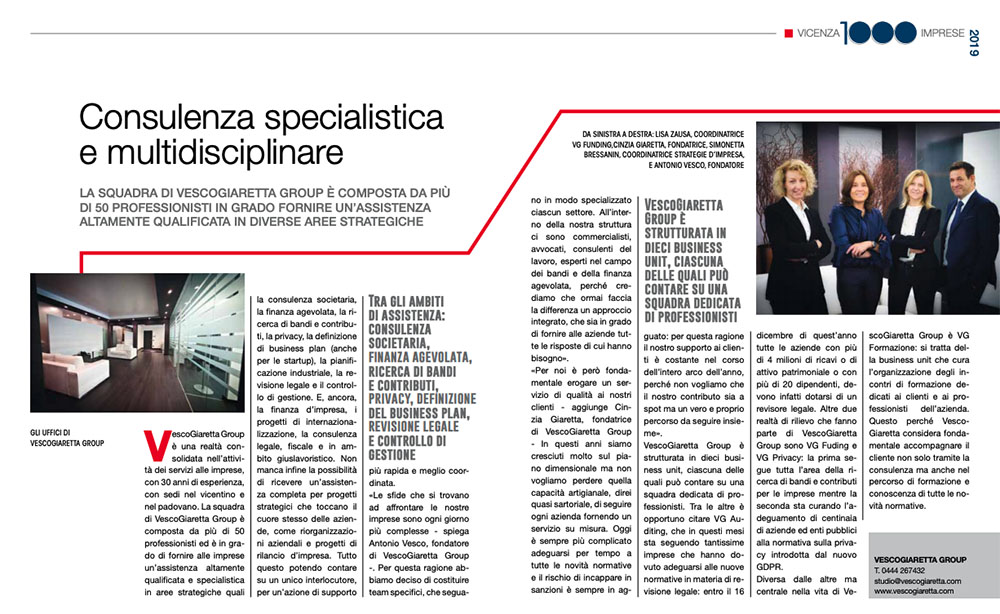 VescoGiaretta Group è una realtà consolidata nell’attività dei servizi alle imprese, con 30 anni di esperienza, con sedi nel vicentino e nel padovano. La squadra di VescoGiaretta Group è composta da più di 50 professionisti ed è in grado di fornire alle imprese un’assistenza altamente qualificata e specialistica in aree strategiche quali la consulenza societaria, la finanza agevolata, la ricerca di bandi e contributi, la privacy, la definizione di business plan (anche per le startup), la pianificazione industriale, la revisione legale e il controllo di gestione. E, ancora, la finanza d’impresa, i progetti di internazionalizzazione, la consulenza legale, fiscale e in ambito giuslavoristico. Non manca infine la possibilità di ricevere un’assistenza completa per progetti strategici che toccano il cuore stesso delle aziende, come riorganizzazioni aziendali e progetti di rilancio d’impresa. Tutto questo potendo contare su un unico interlocutore, per un’azione di supporto più rapida e meglio coordinata.