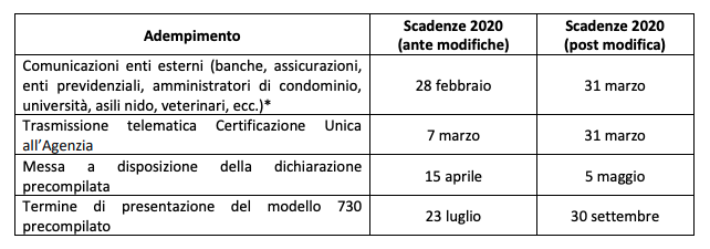 - è stata posticipata al 31 marzo 2020 la scadenza prevista per la trasmissione della Certificazione Unica (ordinariamente fissata al 7 marzo),