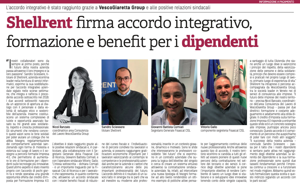 “I nostri collaboratori sono da sempre al primo posto, perché il futuro della nostra azienda passa attraverso il loro impegno e la loro passione”. Sandro Sciessere, titolare di Shellrent, azienda vicentina leader nella fornitura di servizi informatici, esprime la sua soddisfazione per l’accordo integrativo aziendale siglato nelle scorse settimane, che integra e rafforza il precedente accordo sottoscritto nel 2018.